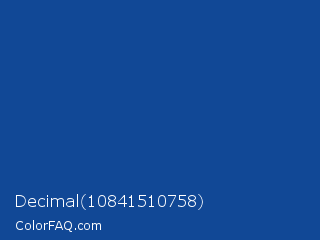 Decimal 10841510758 Color is a normal blue color and the nearest color is Yale Blue #0f4d92. Hex code #114896 and RGB value is rgb(17,72,150). In RGB color space, this color is composed of 7% red, 28% green, 59% blue, In CMYK color space, this color is composed of 89% cyan, 52% magenta, 0% yellow , 41% black , In HSL color space, this color has a hue angle of 215° , 80% saturation and 33% lightness.