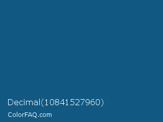 Decimal 10841527960 Color is a dark blue color and the nearest color is Blue Sapphire #126180. Hex code #115982 and RGB value is rgb(17,89,130). In RGB color space, this color is composed of 7% red, 35% green, 51% blue, In CMYK color space, this color is composed of 87% cyan, 32% magenta, 0% yellow , 49% black , In HSL color space, this color has a hue angle of 202° , 77% saturation and 29% lightness.