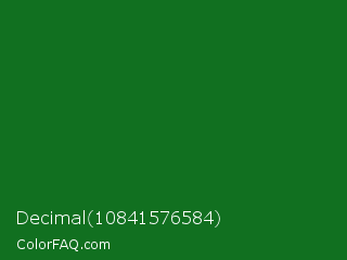 Decimal 10841576584 Color is a dark green color and the nearest color is La Salle Green #087830. Hex code #117020 and RGB value is rgb(17,112,32). In RGB color space, this color is composed of 7% red, 44% green, 13% blue, In CMYK color space, this color is composed of 85% cyan, 0% magenta, 71% yellow , 56% black , In HSL color space, this color has a hue angle of 129° , 74% saturation and 25% lightness.