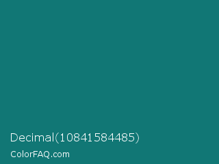 Decimal 10841584485 Color is a dark cyan color and the nearest color is Surfie Green #0c7a79. Hex code #117775 and RGB value is rgb(17,119,117). In RGB color space, this color is composed of 7% red, 47% green, 46% blue, In CMYK color space, this color is composed of 86% cyan, 0% magenta, 2% yellow , 53% black , In HSL color space, this color has a hue angle of 179° , 75% saturation and 27% lightness.