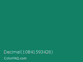 Decimal 10841593426 Color is a dark cyan color and the nearest color is Deep Green Cyan Turquoise #0e7c61. Hex code #118064 and RGB value is rgb(17,128,100). In RGB color space, this color is composed of 7% red, 50% green, 39% blue, In CMYK color space, this color is composed of 87% cyan, 0% magenta, 22% yellow , 50% black , In HSL color space, this color has a hue angle of 165° , 77% saturation and 28% lightness.