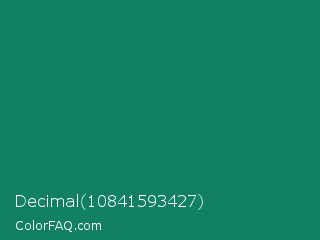 Decimal 10841593427 Color is a dark cyan color and the nearest color is Deep Green Cyan Turquoise #0e7c61. Hex code #118065 and RGB value is rgb(17,128,101). In RGB color space, this color is composed of 7% red, 50% green, 40% blue, In CMYK color space, this color is composed of 87% cyan, 0% magenta, 21% yellow , 50% black , In HSL color space, this color has a hue angle of 165° , 77% saturation and 28% lightness.