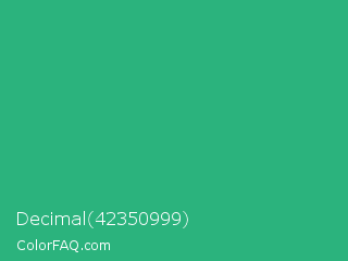 Decimal 42350999 Color is a normal green color and the nearest color is Jungle Green #29ab87. Hex code #2bb37d and RGB value is rgb(43,179,125). In RGB color space, this color is composed of 17% red, 70% green, 49% blue, In CMYK color space, this color is composed of 76% cyan, 0% magenta, 30% yellow , 30% black , In HSL color space, this color has a hue angle of 156° , 61% saturation and 44% lightness.