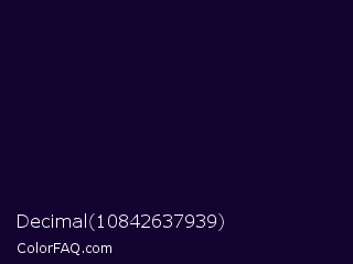 Decimal 10842637939 Color is a very dark violet color and the nearest color is Black Rock #0d0332. Hex code #130331 and RGB value is rgb(19,3,49). In RGB color space, this color is composed of 7% red, 1% green, 19% blue, In CMYK color space, this color is composed of 61% cyan, 94% magenta, 0% yellow , 81% black , In HSL color space, this color has a hue angle of 261° , 88% saturation and 10% lightness.