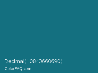 Decimal 10843660690 Color is a dark cyan color and the nearest color is Surfie Green #0c7a79. Hex code #147080 and RGB value is rgb(20,112,128). In RGB color space, this color is composed of 8% red, 44% green, 50% blue, In CMYK color space, this color is composed of 84% cyan, 13% magenta, 0% yellow , 50% black , In HSL color space, this color has a hue angle of 189° , 73% saturation and 29% lightness.