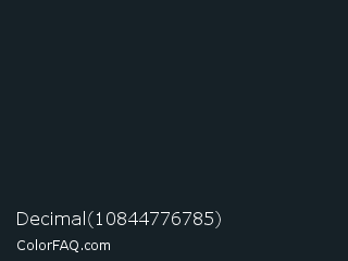 Decimal 10844776785 Color is a very dark blue color and the nearest color is Dark Jungle Green #1a2421. Hex code #162127 and RGB value is rgb(22,33,39). In RGB color space, this color is composed of 9% red, 13% green, 15% blue, In CMYK color space, this color is composed of 44% cyan, 15% magenta, 0% yellow , 85% black , In HSL color space, this color has a hue angle of 201° , 28% saturation and 12% lightness.