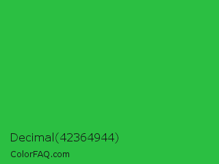 Decimal 42364944 Color is a normal green color and the nearest color is Wageningen Green #34b233. Hex code #2bbf42 and RGB value is rgb(43,191,66). In RGB color space, this color is composed of 17% red, 75% green, 26% blue, In CMYK color space, this color is composed of 77% cyan, 0% magenta, 65% yellow , 25% black , In HSL color space, this color has a hue angle of 129° , 63% saturation and 46% lightness.