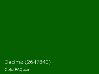 Decimal 2647840 Color is a very dark green color and the nearest color is Dark Green X11 #006400. Hex code #046000 and RGB value is rgb(4,96,0). In RGB color space, this color is composed of 2% red, 38% green, 0% blue, In CMYK color space, this color is composed of 96% cyan, 0% magenta, 100% yellow , 62% black , In HSL color space, this color has a hue angle of 118° , 100% saturation and 19% lightness.