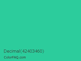 Decimal 42403460 Color is a normal green color and the nearest color is Shamrock #33cc99. Hex code #2bcd9c and RGB value is rgb(43,205,156). In RGB color space, this color is composed of 17% red, 80% green, 61% blue, In CMYK color space, this color is composed of 79% cyan, 0% magenta, 24% yellow , 20% black , In HSL color space, this color has a hue angle of 162° , 65% saturation and 49% lightness.