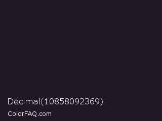 Decimal 10858092369 Color is a very dark purple color and the nearest color is Mirage #161928. Hex code #201727 and RGB value is rgb(32,23,39). In RGB color space, this color is composed of 13% red, 9% green, 15% blue, In CMYK color space, this color is composed of 18% cyan, 41% magenta, 0% yellow , 85% black , In HSL color space, this color has a hue angle of 274° , 26% saturation and 12% lightness.
