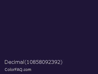 Decimal 10858092392 Color is a very dark indigo color and the nearest color is Haiti #1b1035. Hex code #201738 and RGB value is rgb(32,23,56). In RGB color space, this color is composed of 13% red, 9% green, 22% blue, In CMYK color space, this color is composed of 43% cyan, 59% magenta, 0% yellow , 78% black , In HSL color space, this color has a hue angle of 256° , 42% saturation and 15% lightness.