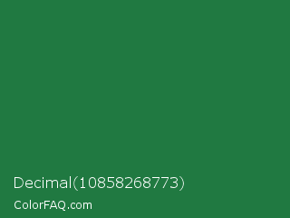 Decimal 10858268773 Color is a dark green color and the nearest color is Dark Spring Green #177245. Hex code #207941 and RGB value is rgb(32,121,65). In RGB color space, this color is composed of 13% red, 47% green, 25% blue, In CMYK color space, this color is composed of 74% cyan, 0% magenta, 46% yellow , 53% black , In HSL color space, this color has a hue angle of 142° , 58% saturation and 30% lightness.