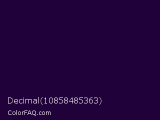 Decimal 10858485363 Color is a very dark purple color and the nearest color is Violet #240a40. Hex code #210139 and RGB value is rgb(33,1,57). In RGB color space, this color is composed of 13% red, 0% green, 22% blue, In CMYK color space, this color is composed of 42% cyan, 98% magenta, 0% yellow , 78% black , In HSL color space, this color has a hue angle of 274° , 97% saturation and 11% lightness.