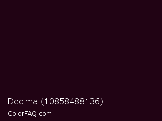 Decimal 10858488136 Color is a almost black magenta color and the nearest color is Night Rider #1f120f. Hex code #210314 and RGB value is rgb(33,3,20). In RGB color space, this color is composed of 13% red, 1% green, 8% blue, In CMYK color space, this color is composed of 0% cyan, 91% magenta, 39% yellow , 87% black , In HSL color space, this color has a hue angle of 326° , 83% saturation and 7% lightness.