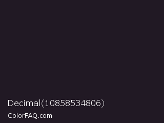 Decimal 10858534806 Color is a very dark purple color and the nearest color is Raisin Black #242124. Hex code #211924 and RGB value is rgb(33,25,36). In RGB color space, this color is composed of 13% red, 10% green, 14% blue, In CMYK color space, this color is composed of 8% cyan, 31% magenta, 0% yellow , 86% black , In HSL color space, this color has a hue angle of 284° , 18% saturation and 12% lightness.