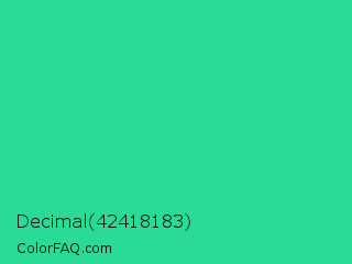Decimal 42418183 Color is a normal green color and the nearest color is Shamrock #33cc99. Hex code #2bda97 and RGB value is rgb(43,218,151). In RGB color space, this color is composed of 17% red, 85% green, 59% blue, In CMYK color space, this color is composed of 80% cyan, 0% magenta, 31% yellow , 15% black , In HSL color space, this color has a hue angle of 157° , 70% saturation and 51% lightness.