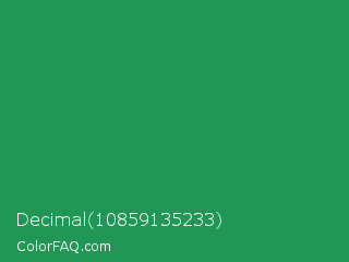 Decimal 10859135233 Color is a normal green color and the nearest color is Eucalyptus #278a5b. Hex code #219755 and RGB value is rgb(33,151,85). In RGB color space, this color is composed of 13% red, 59% green, 33% blue, In CMYK color space, this color is composed of 78% cyan, 0% magenta, 44% yellow , 41% black , In HSL color space, this color has a hue angle of 146° , 64% saturation and 36% lightness.