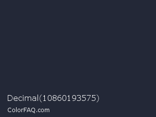 Decimal 10860193575 Color is a very dark blue color and the nearest color is Ebony Clay #26283b. Hex code #232837 and RGB value is rgb(35,40,55). In RGB color space, this color is composed of 14% red, 16% green, 22% blue, In CMYK color space, this color is composed of 36% cyan, 27% magenta, 0% yellow , 78% black , In HSL color space, this color has a hue angle of 225° , 22% saturation and 18% lightness.