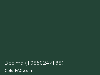 Decimal 10860247188 Color is a very dark green color and the nearest color is Te Papa Green #1e433c. Hex code #234436 and RGB value is rgb(35,68,54). In RGB color space, this color is composed of 14% red, 27% green, 21% blue, In CMYK color space, this color is composed of 49% cyan, 0% magenta, 21% yellow , 73% black , In HSL color space, this color has a hue angle of 155° , 32% saturation and 20% lightness.