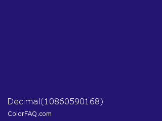 Decimal 10860590168 Color is a dark indigo color and the nearest color is Midnight Blue #191970. Hex code #241572 and RGB value is rgb(36,21,114). In RGB color space, this color is composed of 14% red, 8% green, 45% blue, In CMYK color space, this color is composed of 68% cyan, 82% magenta, 0% yellow , 55% black , In HSL color space, this color has a hue angle of 250° , 69% saturation and 26% lightness.