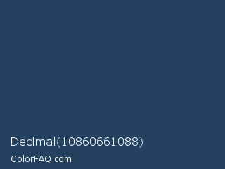 Decimal 10860661088 Color is a dark blue color and the nearest color is Rhino #2e3f62. Hex code #244260 and RGB value is rgb(36,66,96). In RGB color space, this color is composed of 14% red, 26% green, 38% blue, In CMYK color space, this color is composed of 63% cyan, 31% magenta, 0% yellow , 62% black , In HSL color space, this color has a hue angle of 210° , 45% saturation and 26% lightness.