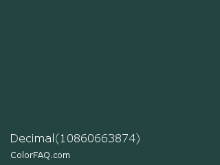 Decimal 10860663874 Color is a very dark cyan color and the nearest color is Japanese Indigo #264348. Hex code #244442 and RGB value is rgb(36,68,66). In RGB color space, this color is composed of 14% red, 27% green, 26% blue, In CMYK color space, this color is composed of 47% cyan, 0% magenta, 3% yellow , 73% black , In HSL color space, this color has a hue angle of 176° , 31% saturation and 20% lightness.