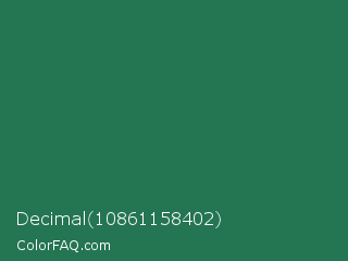 Decimal 10861158402 Color is a dark green color and the nearest color is Dark Spring Green #177245. Hex code #247552 and RGB value is rgb(36,117,82). In RGB color space, this color is composed of 14% red, 46% green, 32% blue, In CMYK color space, this color is composed of 69% cyan, 0% magenta, 30% yellow , 54% black , In HSL color space, this color has a hue angle of 154° , 53% saturation and 30% lightness.