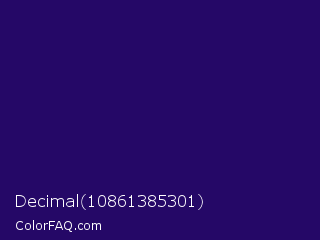 Decimal 10861385301 Color is a very dark indigo color and the nearest color is Paris M #26056a. Hex code #250867 and RGB value is rgb(37,8,103). In RGB color space, this color is composed of 15% red, 3% green, 40% blue, In CMYK color space, this color is composed of 64% cyan, 92% magenta, 0% yellow , 60% black , In HSL color space, this color has a hue angle of 258° , 86% saturation and 22% lightness.