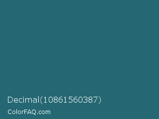 Decimal 10861560387 Color is a dark cyan color and the nearest color is Casal #2f6168. Hex code #256873 and RGB value is rgb(37,104,115). In RGB color space, this color is composed of 15% red, 41% green, 45% blue, In CMYK color space, this color is composed of 68% cyan, 10% magenta, 0% yellow , 55% black , In HSL color space, this color has a hue angle of 188° , 51% saturation and 30% lightness.