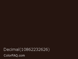 Decimal 10862232626 Color is a very dark red color and the nearest color is Gondola #261414. Hex code #261510 and RGB value is rgb(38,21,16). In RGB color space, this color is composed of 15% red, 8% green, 6% blue, In CMYK color space, this color is composed of 0% cyan, 45% magenta, 58% yellow , 85% black , In HSL color space, this color has a hue angle of 14° , 41% saturation and 11% lightness.