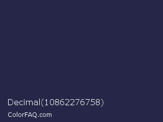 Decimal 10862276758 Color is a very dark blue color and the nearest color is Port Gore #251f4f. Hex code #262748 and RGB value is rgb(38,39,72). In RGB color space, this color is composed of 15% red, 15% green, 28% blue, In CMYK color space, this color is composed of 47% cyan, 46% magenta, 0% yellow , 72% black , In HSL color space, this color has a hue angle of 238° , 31% saturation and 22% lightness.