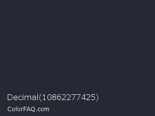 Decimal 10862277425 Color is a very dark blue color and the nearest color is Charade #292937. Hex code #262833 and RGB value is rgb(38,40,51). In RGB color space, this color is composed of 15% red, 16% green, 20% blue, In CMYK color space, this color is composed of 25% cyan, 22% magenta, 0% yellow , 80% black , In HSL color space, this color has a hue angle of 231° , 15% saturation and 17% lightness.