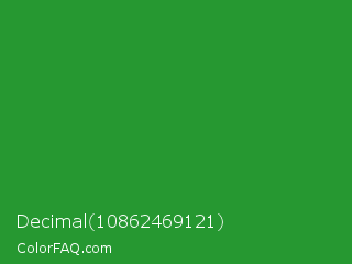 Decimal 10862469121 Color is a normal green color and the nearest color is Forest Green #228b22. Hex code #269831 and RGB value is rgb(38,152,49). In RGB color space, this color is composed of 15% red, 60% green, 19% blue, In CMYK color space, this color is composed of 75% cyan, 0% magenta, 68% yellow , 40% black , In HSL color space, this color has a hue angle of 126° , 60% saturation and 37% lightness.