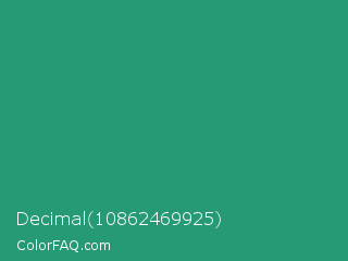 Decimal 10862469925 Color is a normal green color and the nearest color is Illuminating Emerald #319177. Hex code #269975 and RGB value is rgb(38,153,117). In RGB color space, this color is composed of 15% red, 60% green, 46% blue, In CMYK color space, this color is composed of 75% cyan, 0% magenta, 24% yellow , 40% black , In HSL color space, this color has a hue angle of 161° , 60% saturation and 37% lightness.