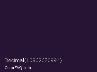 Decimal 10862670994 Color is a very dark purple color and the nearest color is Revolver #2c1632. Hex code #271334 and RGB value is rgb(39,19,52). In RGB color space, this color is composed of 15% red, 7% green, 20% blue, In CMYK color space, this color is composed of 25% cyan, 63% magenta, 0% yellow , 80% black , In HSL color space, this color has a hue angle of 276° , 46% saturation and 14% lightness.