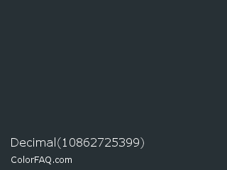 Decimal 10862725399 Color is a very dark blue color and the nearest color is Gunmetal #2a3439. Hex code #273035 and RGB value is rgb(39,48,53). In RGB color space, this color is composed of 15% red, 19% green, 21% blue, In CMYK color space, this color is composed of 26% cyan, 9% magenta, 0% yellow , 79% black , In HSL color space, this color has a hue angle of 201° , 15% saturation and 18% lightness.