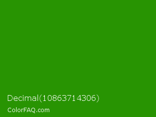 Decimal 10863714306 Color is a dark green color and the nearest color is Napier Green #2a8000. Hex code #289402 and RGB value is rgb(40,148,2). In RGB color space, this color is composed of 16% red, 58% green, 1% blue, In CMYK color space, this color is composed of 73% cyan, 0% magenta, 99% yellow , 42% black , In HSL color space, this color has a hue angle of 104° , 97% saturation and 29% lightness.