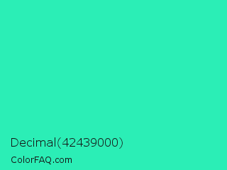 Decimal 42439000 Color is a normal green color and the nearest color is Turquoise PWG #30d5c8. Hex code #2beeb6 and RGB value is rgb(43,238,182). In RGB color space, this color is composed of 17% red, 93% green, 71% blue, In CMYK color space, this color is composed of 82% cyan, 0% magenta, 24% yellow , 7% black , In HSL color space, this color has a hue angle of 163° , 85% saturation and 55% lightness.