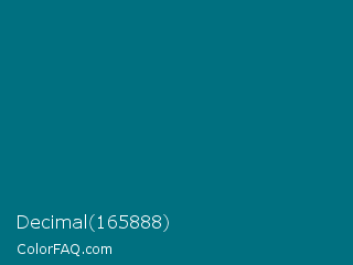Decimal 165888 Color is a dark cyan color and the nearest color is Blue Lagoon #017987. Hex code #007080 and RGB value is rgb(0,112,128). In RGB color space, this color is composed of 0% red, 44% green, 50% blue, In CMYK color space, this color is composed of 100% cyan, 13% magenta, 0% yellow , 50% black , In HSL color space, this color has a hue angle of 188° , 100% saturation and 25% lightness.