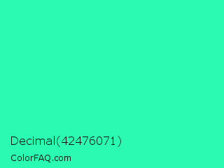 Decimal 42476071 Color is a normal green color and the nearest color is Turquoise PWG #30d5c8. Hex code #2bfab3 and RGB value is rgb(43,250,179). In RGB color space, this color is composed of 17% red, 98% green, 70% blue, In CMYK color space, this color is composed of 83% cyan, 0% magenta, 28% yellow , 2% black , In HSL color space, this color has a hue angle of 159° , 95% saturation and 57% lightness.