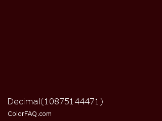 Decimal 10875144471 Color is a very dark red color and the nearest color is Sepia Black #2b0202. Hex code #300205 and RGB value is rgb(48,2,5). In RGB color space, this color is composed of 19% red, 1% green, 2% blue, In CMYK color space, this color is composed of 0% cyan, 96% magenta, 90% yellow , 81% black , In HSL color space, this color has a hue angle of 356° , 92% saturation and 10% lightness.