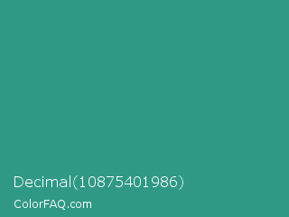 Decimal 10875401986 Color is a normal cyan color and the nearest color is Lochinvar #2c8c84. Hex code #309986 and RGB value is rgb(48,153,134). In RGB color space, this color is composed of 19% red, 60% green, 53% blue, In CMYK color space, this color is composed of 69% cyan, 0% magenta, 12% yellow , 40% black , In HSL color space, this color has a hue angle of 169° , 52% saturation and 39% lightness.