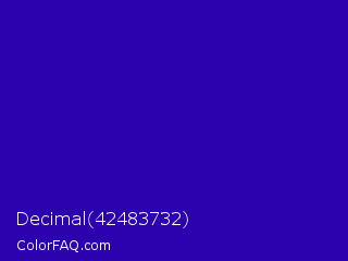 Decimal 42483732 Color is a normal indigo color and the nearest color is Interdimensional Blue #360ccc. Hex code #2c01ae and RGB value is rgb(44,1,174). In RGB color space, this color is composed of 17% red, 0% green, 68% blue, In CMYK color space, this color is composed of 75% cyan, 99% magenta, 0% yellow , 32% black , In HSL color space, this color has a hue angle of 255° , 99% saturation and 34% lightness.