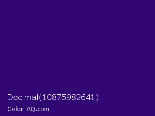 Decimal 10875982641 Color is a dark violet color and the nearest color is Blue Diamond #380474. Hex code #310573 and RGB value is rgb(49,5,115). In RGB color space, this color is composed of 19% red, 2% green, 45% blue, In CMYK color space, this color is composed of 57% cyan, 96% magenta, 0% yellow , 55% black , In HSL color space, this color has a hue angle of 264° , 92% saturation and 24% lightness.