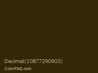 Decimal 10877290903 Color is a very dark orange color and the nearest color is Onion #2f270e. Hex code #332705 and RGB value is rgb(51,39,5). In RGB color space, this color is composed of 20% red, 15% green, 2% blue, In CMYK color space, this color is composed of 0% cyan, 24% magenta, 90% yellow , 80% black , In HSL color space, this color has a hue angle of 44° , 82% saturation and 11% lightness.