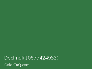 Decimal 10877424953 Color is a normal green color and the nearest color is Killarney #3a6a47. Hex code #337743 and RGB value is rgb(51,119,67). In RGB color space, this color is composed of 20% red, 47% green, 26% blue, In CMYK color space, this color is composed of 57% cyan, 0% magenta, 44% yellow , 53% black , In HSL color space, this color has a hue angle of 134° , 40% saturation and 33% lightness.