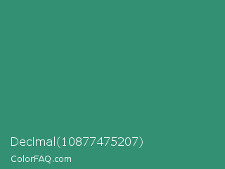 Decimal 10877475207 Color is a normal green color and the nearest color is Illuminating Emerald #319177. Hex code #339073 and RGB value is rgb(51,144,115). In RGB color space, this color is composed of 20% red, 56% green, 45% blue, In CMYK color space, this color is composed of 65% cyan, 0% magenta, 20% yellow , 44% black , In HSL color space, this color has a hue angle of 161° , 48% saturation and 38% lightness.