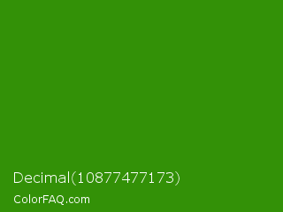 Decimal 10877477173 Color is a dark green color and the nearest color is La Palma #368716. Hex code #339107 and RGB value is rgb(51,145,7). In RGB color space, this color is composed of 20% red, 57% green, 3% blue, In CMYK color space, this color is composed of 65% cyan, 0% magenta, 95% yellow , 43% black , In HSL color space, this color has a hue angle of 101° , 91% saturation and 30% lightness.