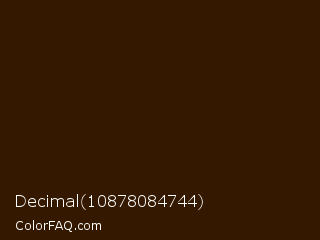 Decimal 10878084744 Color is a very dark orange color and the nearest color is Jacko Bean #2e1905. Hex code #341800 and RGB value is rgb(52,24,0). In RGB color space, this color is composed of 20% red, 9% green, 0% blue, In CMYK color space, this color is composed of 0% cyan, 54% magenta, 100% yellow , 80% black , In HSL color space, this color has a hue angle of 28° , 100% saturation and 10% lightness.