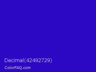 Decimal 42492729 Color is a normal indigo color and the nearest color is Interdimensional Blue #360ccc. Hex code #2c0ac3 and RGB value is rgb(44,10,195). In RGB color space, this color is composed of 17% red, 4% green, 76% blue, In CMYK color space, this color is composed of 77% cyan, 95% magenta, 0% yellow , 24% black , In HSL color space, this color has a hue angle of 251° , 90% saturation and 40% lightness.